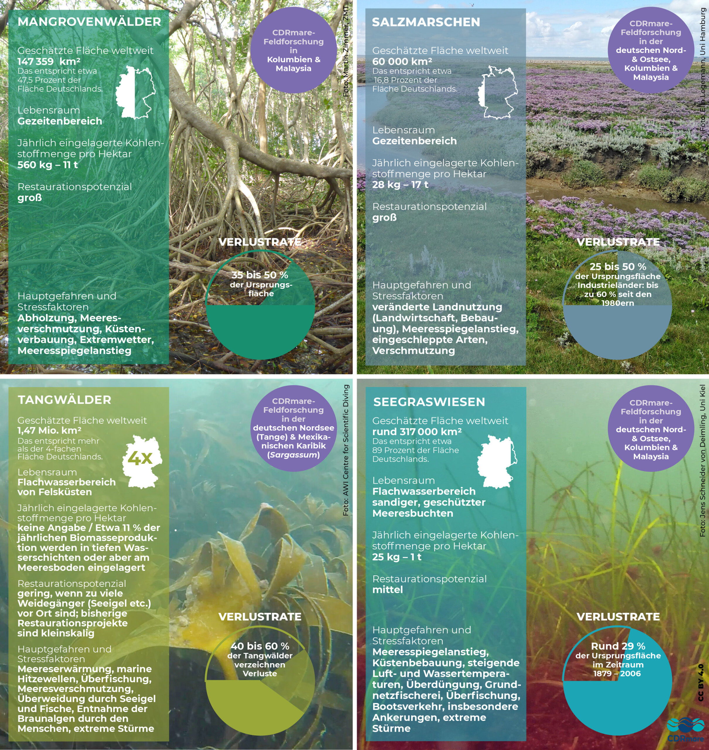 - Löschke, S., M. Paul, S. Reents, L. Sander, M. Wölfelschneider, N. Oppelt, K. Burkhard, E. Thomsen, U. Bernitt (2025): Die wichtigsten Ergebnisse der Forschung zum CO2-Entnahmepotenzial der Seegraswiesen und Salzmarschen entlang der deutschen Küste, pp. 1-16, DOI 10.3289/CDRmare.56, https://cdrmare.de/wp-content/uploads/2025/10/insights_BlueCarbon_251021.pdf